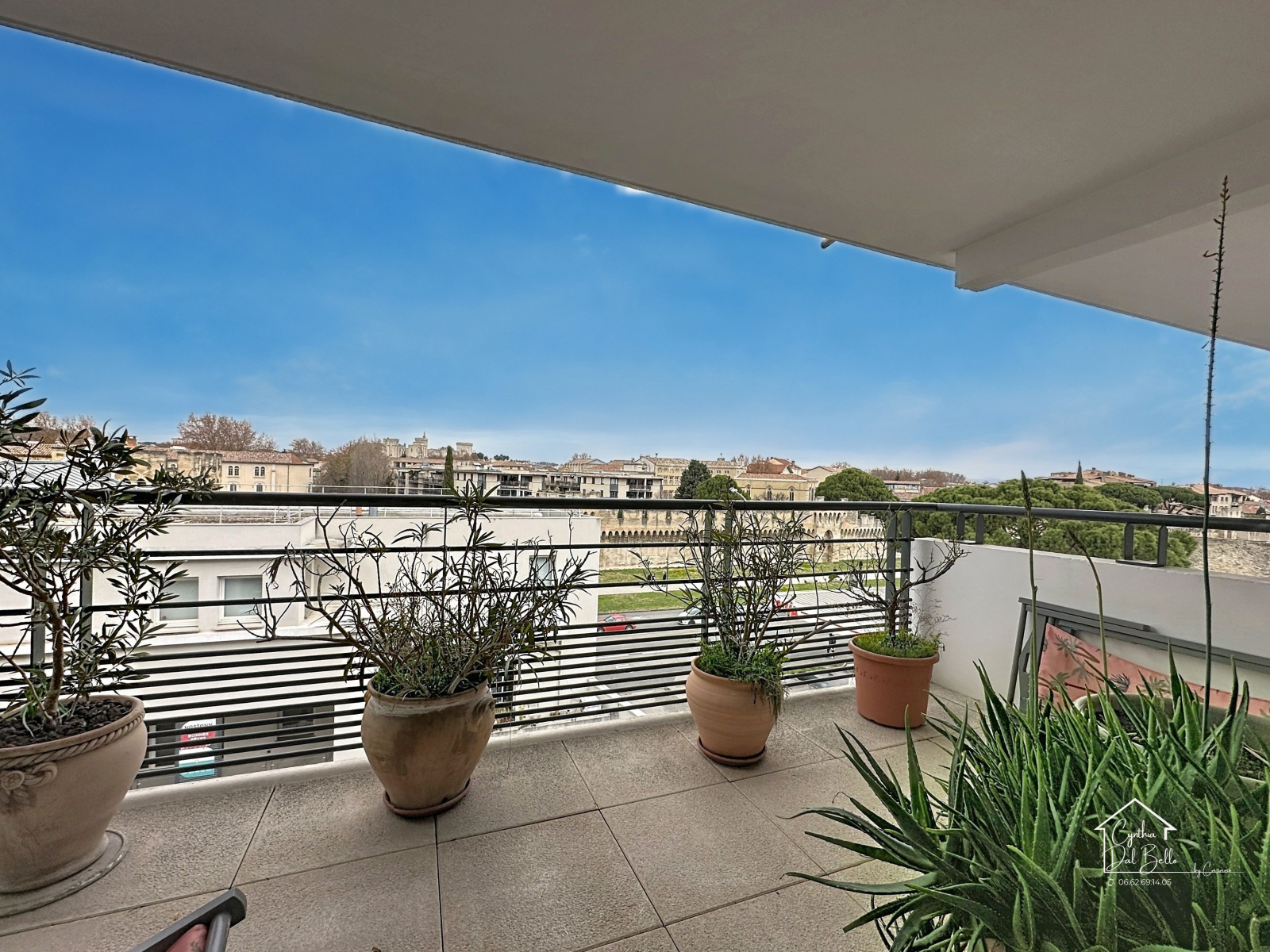 Accès direct à une terrasse agréable avec une très belle vue sur les remparts d’Avignon ainsi que le Palais des Papes et Notre- Dame- Des- Doms